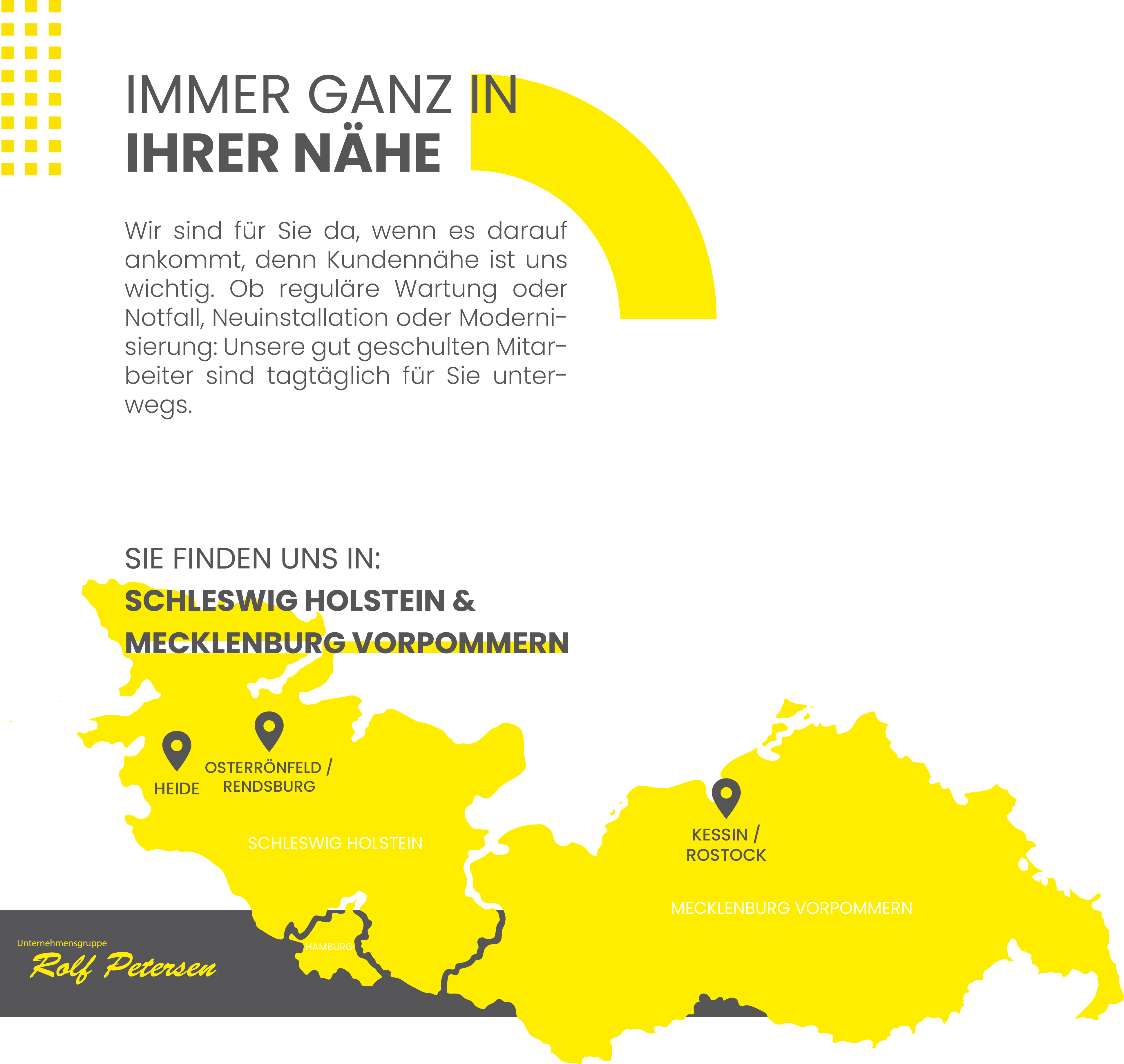 Die Unternehmensgruppe Rolf Petersen ist ein Dienstleister im Bereich Heizungsbau, Sanitäranlagen sowie Klima- und Lüftungstechnik. Auf drei Standorte im Bereich Nord- und Nordostdeutschland verteilt, werden die Projekte im Bereich des privaten Hausbaus, Wohnungsbaus, Gewerbebaus und der Installation in sozialen oder öffentlich genutzten Gebäuden vom Firmensitz in Osterrönfeld verteilt und koordiniert.